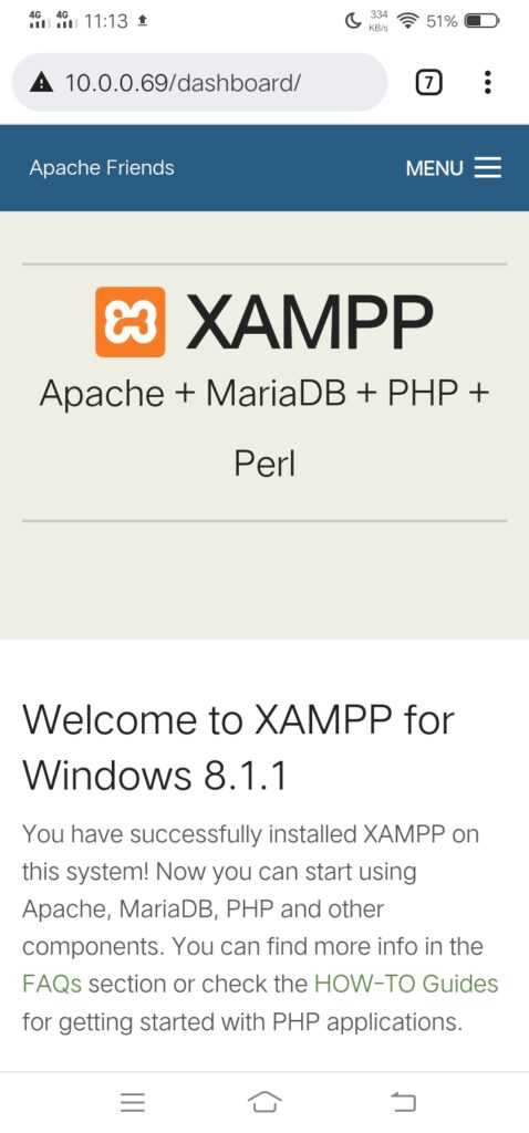 If you're using XAMPP, it should go to XAMPP's dashboard in both devices. It means your phone can already access your site.