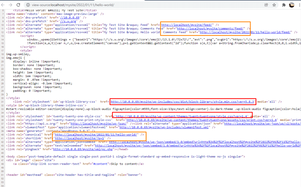In the screenshot above, you will see that the URLs with the IP address (red boxes) are the core files of WordPress such as wp-includes and wp-content. The URLs with localhost (orange boxes), which is the Site Address (URL), are those that links to the content of your site such as pages and posts.
