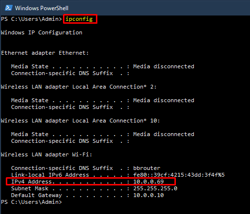 Open a terminal and type ipconfig in Windows or **ifconfig** in Linux and Mac. It should display your network details. Look for the IPv4 address section. The address usually starts with 192.168.x.x or 10.0.x.x. Copy it.