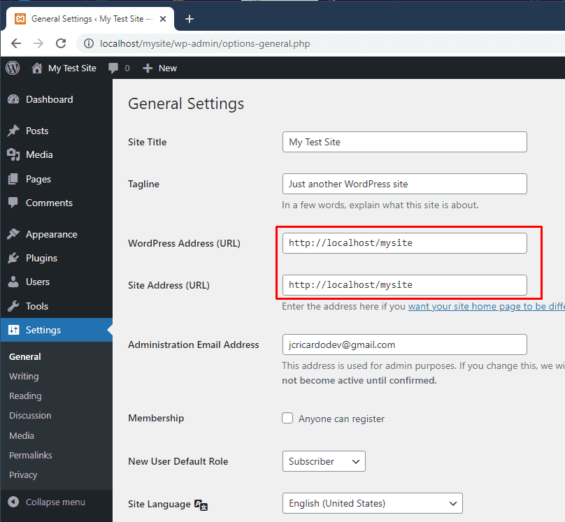 Using WordPress Address (URL): 10.0.0.69/mysite and Site Address (URL): localhost/mysite